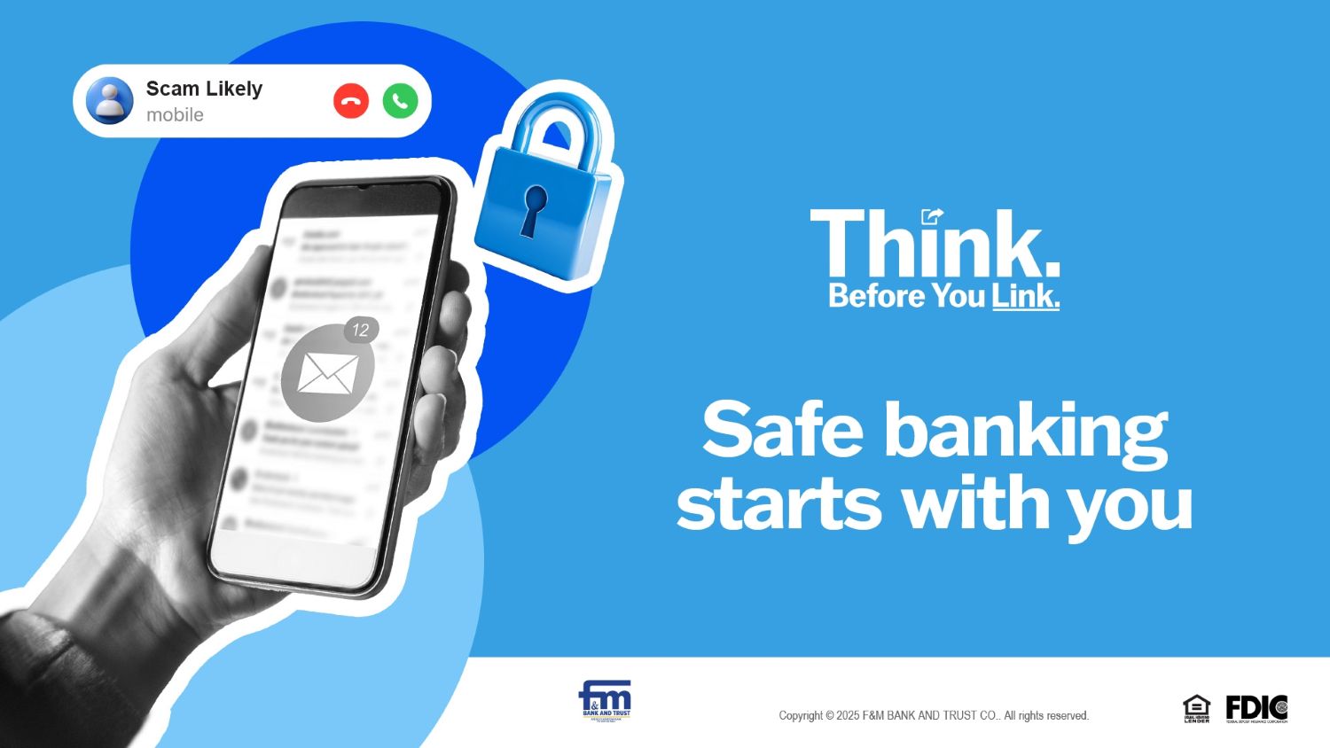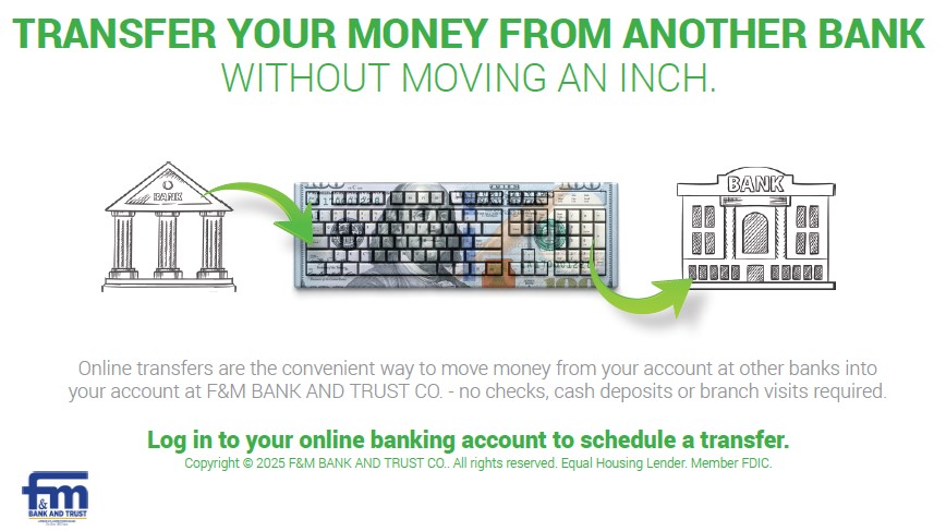 You are leaving F&M Bank and Trust's website and linking to a third party site. Please be advised that you will then link to a website hosted by another party, where you will no longer be subject to, or under the protection of, the privacy and security policies of F&M Bank and Trust. We recommend that you review and evaluate the privacy and security policies of the site that you are entering. F&M Bank and Trust assumes no liability for the content, information, security, policies or transactions provided by these other sites.